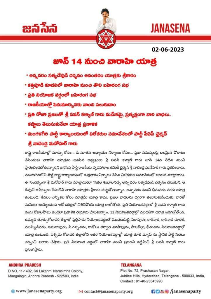 ఆంధ్ర ప్రదేశ్రాజమండ్రివారాహి యాత్రవిజయవాడ జూన్ 14 నుంచి వారాహి యాత్ర June 8, 2023 admin Share this Post జూన్ 14 నుంచి వారాహి యాత్ర, అన్నవరం సత్యదేవుడి ఆశీస్సులతో యాత్రకు శ్రీకారం Varahi Yatra will start from June 14 with the blessings of Lord Satyadeva Annavaram. Share this Post