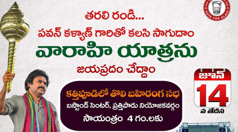 Read Moreకత్తిపూడిలో “వారాహి యాత్ర” తొలి బహిరంగ సభ వారాహి యాత్రలో భాగంగా జూన్ 14న ఉమ్మడి తూర్పు గోదావరి జిల్లా, ప్రత్తిపాడు నియోజకవర్గం, కత్తిపూడిలో ప్రారంభోత్సవ బహిరంగ